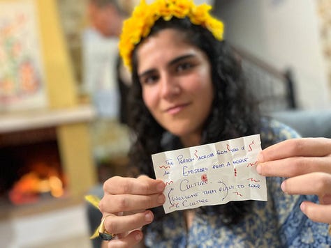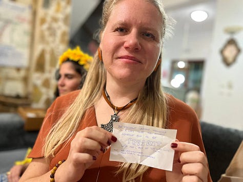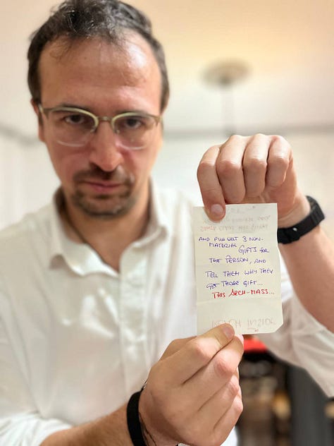 During the Arhcamas Christmas, Anne Chloé held a space for a space where there were 11 boxes, with a chocolate inside and a message that was a doorway for presence. One person starts by taking a random box that is her gift to be gifted to someone in the circle, but is not her who chooses. The person with the last age in the group goes pointing to each person in the group. The person with more age in the group closes her eyes and says stop. Whoever the finger is pointing at when the younger person stops with their hand is the one the gift giver opens the gift for.