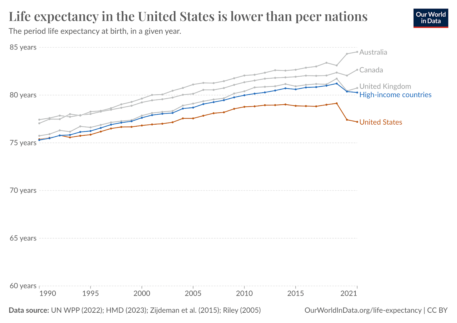 The second main reason, oversimplifying things greatly, is that America’s ideas around individualism, of the power of being responsible for yourself and expecting nothing from others, can go totally awry. America was founded by people escaping persecution by moving to a new land, and for most of its history, any time things were bad economically, or socially, or politically, people could just move west to new states and territories. Even today, America has a population density of 38/km2, while Europe’s population density is 72/km2. What that means is that people in America have a “cut and run” survival strategy. Things get bad? Just move somewhere else. Just move to a dirt road somewhere where the government won’t bother you. In Europe, it seems, people have adopted a different strategy: learn to cooperate, learn to share, learn to collectively govern, learn to not leave others behind.